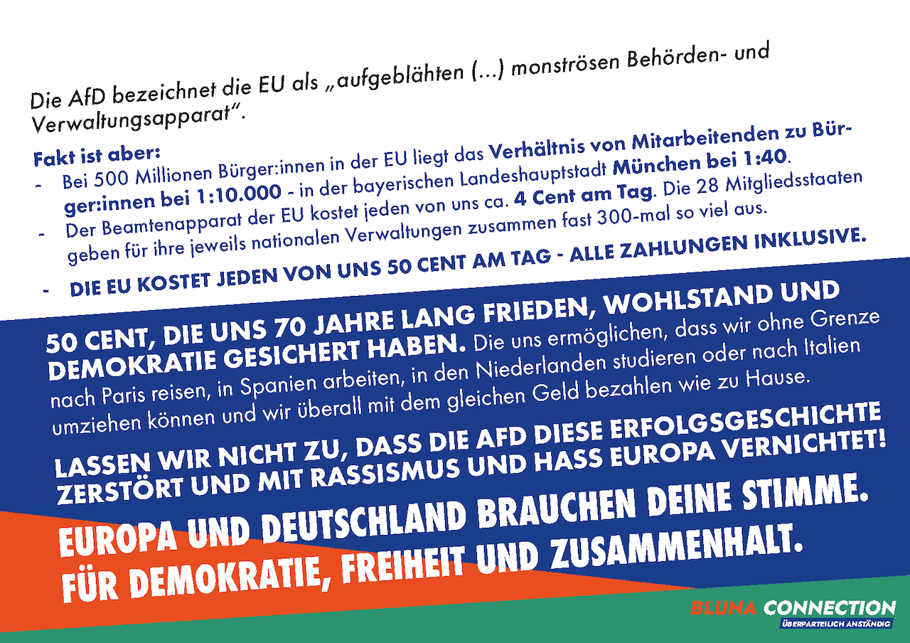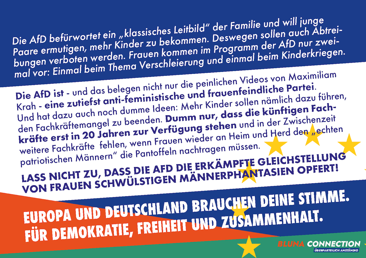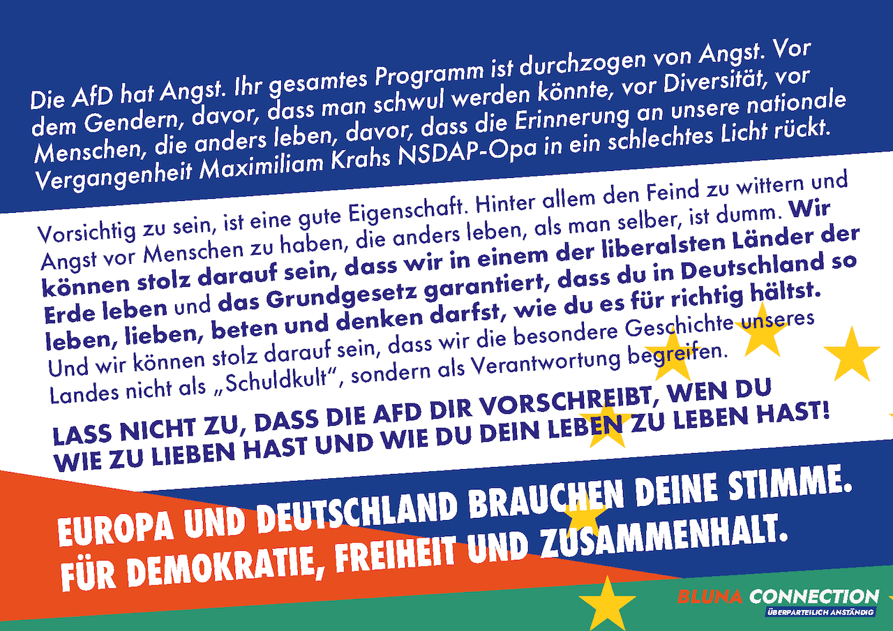 Sicherlich wäre es sehr wünschenswert gewesen, wenn wir mit den Aktionen der BLUNA CONNECTION zusammen mit den Omas gegen Rechts das Wahlergebnis der AfD in Ratingen noch weiter hätten drücken können. Immerhin aber konnte die AfD in Ratingen weiterhin erfolgreich auf die Plätze verwiesen werden.
